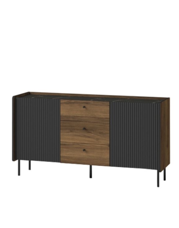 Eleganckie kolory komody - czarny, san sebastian i orzech warmia, wysokie nóżki i ryflowane fronty sprawiają, ze komoda prezentuje się lekko.