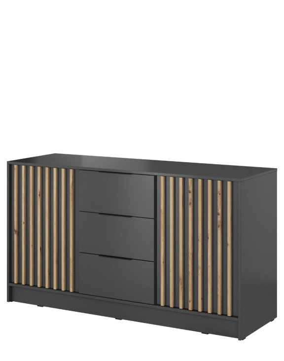 Charakterystycznym elementem komody są lamele w kolorze dąb artisan umieszczone na drzwiach, które dodają jej unikalnego stylu i charakteru.