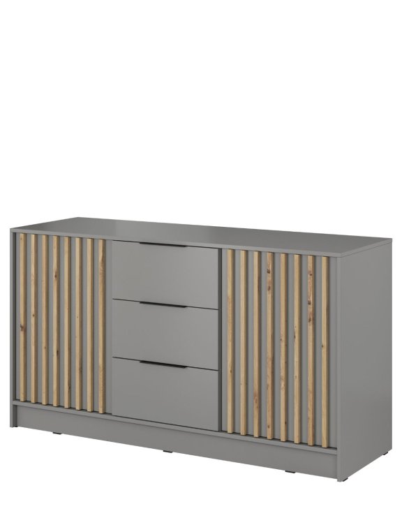 Charakterystycznym elementem komody są lamele w kolorze dąb artisan umieszczone na drzwiach, które dodają jej unikalnego stylu i charakteru.