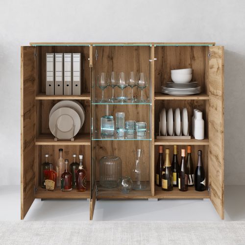 Komoda z witryną Vera to połączenia elegancji, nowoczesnego designu i funkcjonalności, który wnosi do wnętrza wyjątkowy klimat. Jej minimalistyczna forma, wykończona w odcieniu dąb wotan wprowadza do wnętrza nutę luksusu i wyrafinowania, tworząc wyjątkowy kontrast wobec subtelnego, chłodnego światła LED podkreślającego szklane półki.
