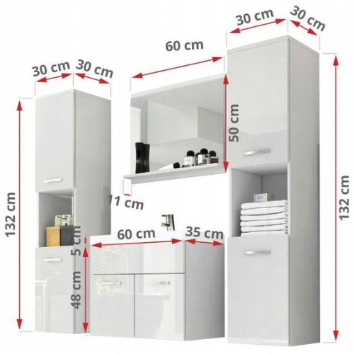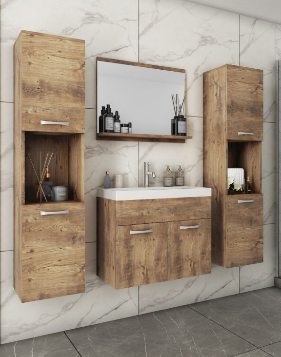 Zestaw został wykonany z wysokiej jakości płyty MDF odpornej na wilgoć i zarysowania, dzięki czemu świetnie sprawdza się w warunkach łazienkowych. Starannie dopasowane detale, takie jak minimalistyczne uchwyty czy precyzyjne wykończenia, podkreślają nowoczesny styl mebli i nadają im wyjątkowy charakter.