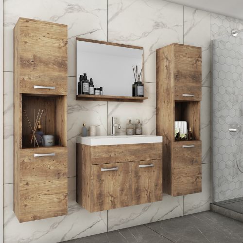 Zestaw mebli łazienkowych Montreal XL kasztan. Zestaw obejmuje pojemne szafki wiszące, wiszącą szafkę pod umywalkę, lustro z dyskretną półką i umywalkę 60 cm. Zestaw zapewnia mnóstwo miejsca do przechowywania kosmetyków, ręczników i akcesoriów łazienkowych.