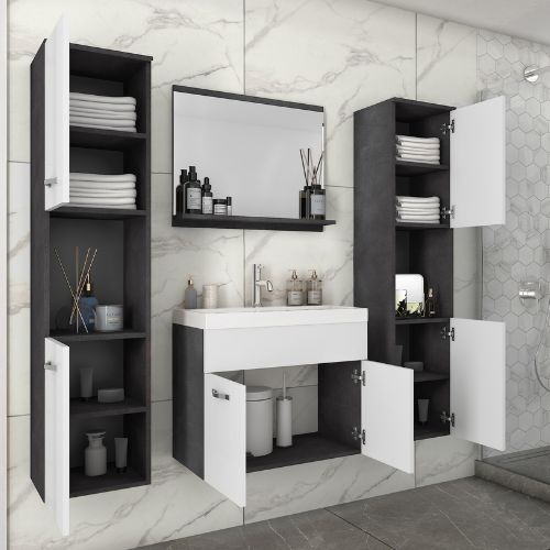 Zestaw został wykonany z wysokiej jakości płyty MDF odpornej na wilgoć i zarysowania, dzięki czemu świetnie sprawdza się w warunkach łazienkowych. Starannie dopasowane detale, takie jak minimalistyczne uchwyty czy precyzyjne wykończenia, podkreślają nowoczesny styl mebli i nadają im wyjątkowy charakter.