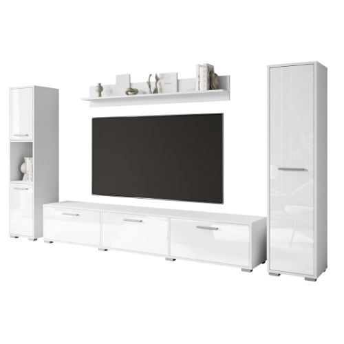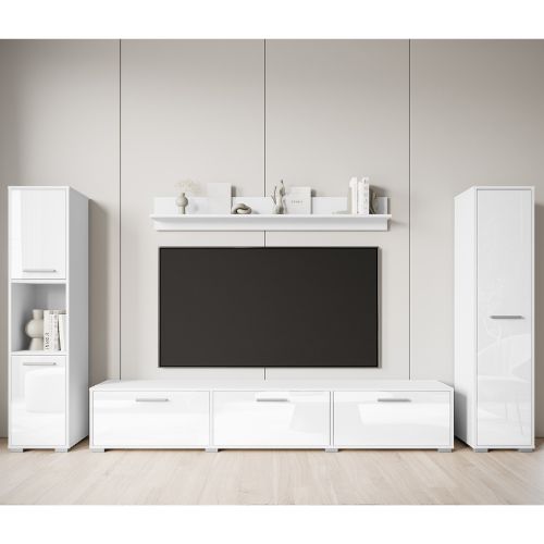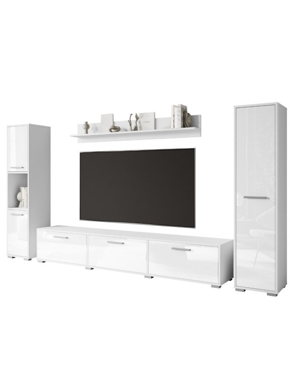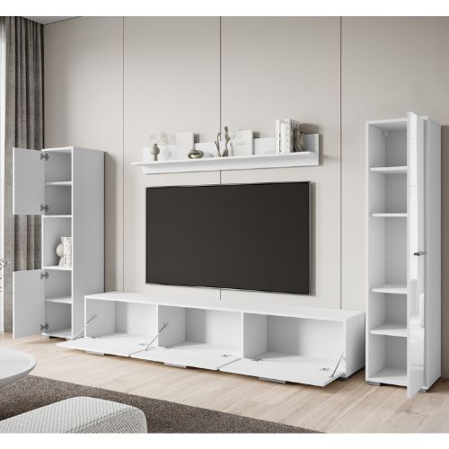 Zestaw mebli do salonu Bogota XL z frontami w kolorze białym połysk, które odbijają światło, optycznie powiększając przestrzeń i nadając jej nowoczesny, elegancki charakter.