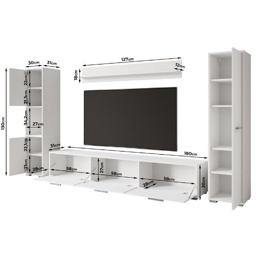 Zestaw mebli sprawdzi się idealnie, jako centralna zabudowa ściany TV, ale również jako baza do aranżacji z dodatkami w drewnie, czerni lub szarościach.