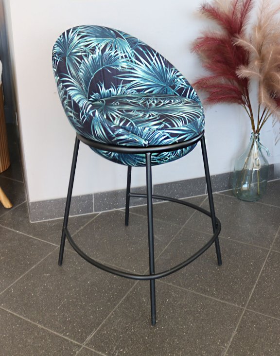 Siedzisko i oparcie tapicerowane są miłą w dotyku tkaniną z wyraźną teksturą, z wzorem w liście palmy.