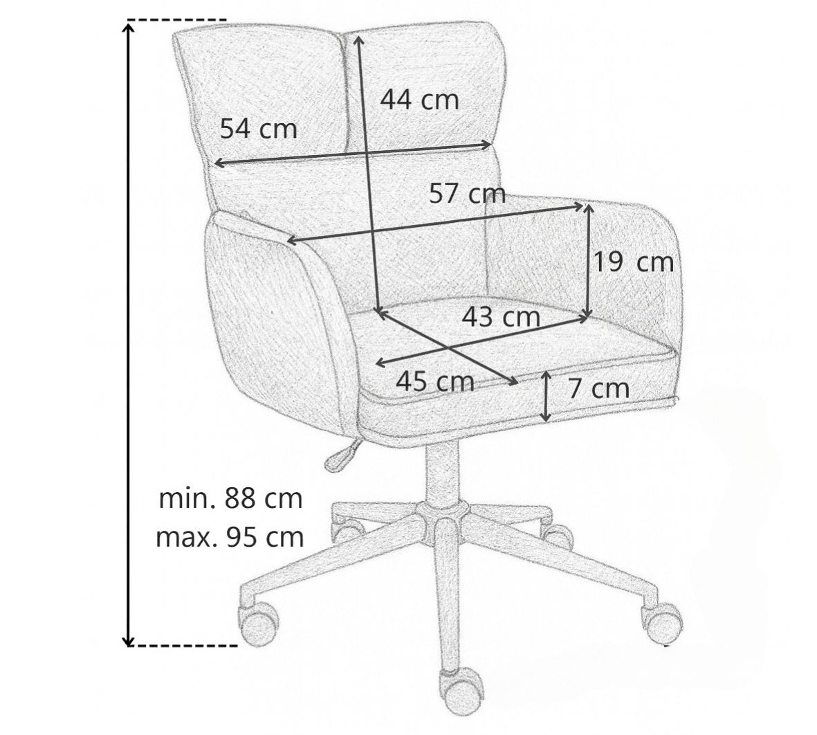 Obrotowe siedzisko z regulacją wysokości góra-dół pozwala dopasować krzesło do indywidualnych potrzeb, a stabilna podstawa na kółkach zapewnia swobodę ruchu i mobilność przy biurku.