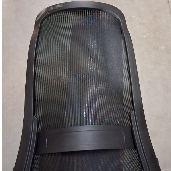 Oparcie krzesła Bodo tapicerowane jest wytrzymałą siatką w kolorze czarnym.