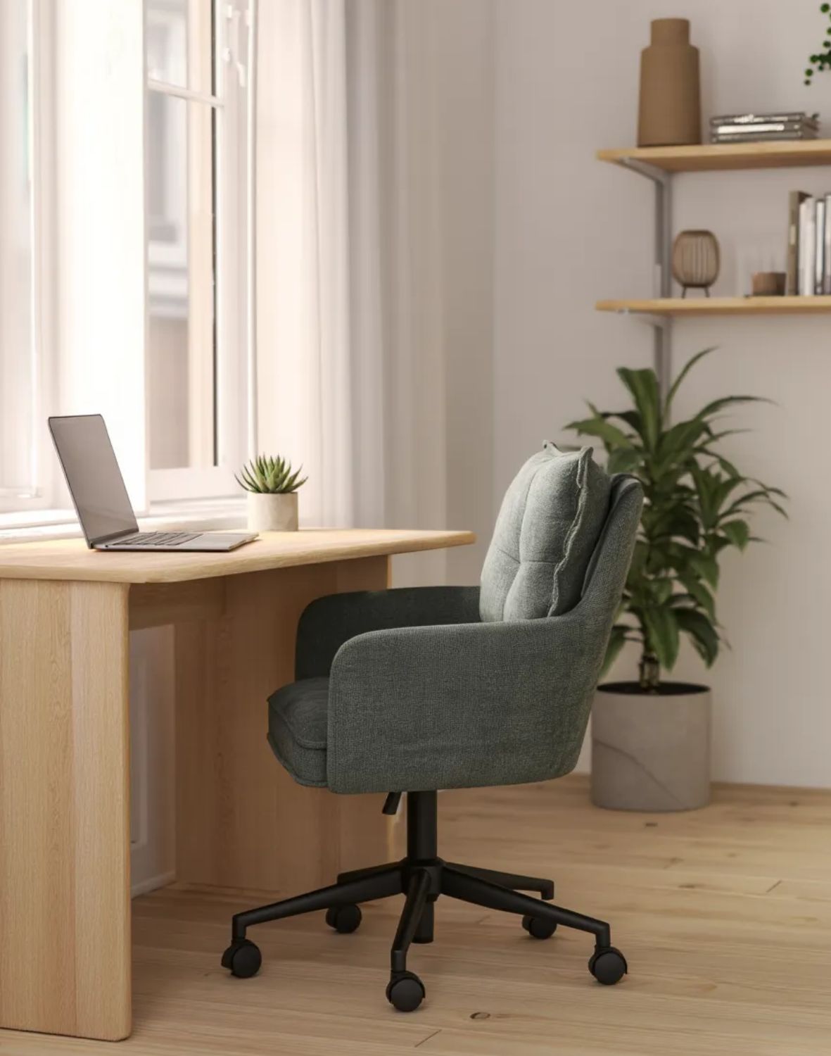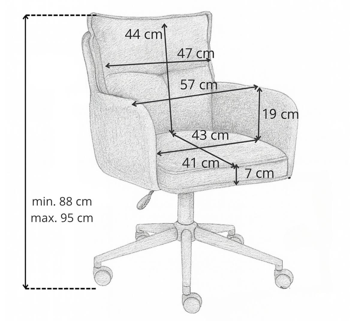 Obrotowe siedzisko z regulacją wysokości pozwala dopasować krzesło do indywidualnych potrzeb, a stabilna podstawa na kółkach zapewnia swobodę ruchu i mobilność przy biurku.