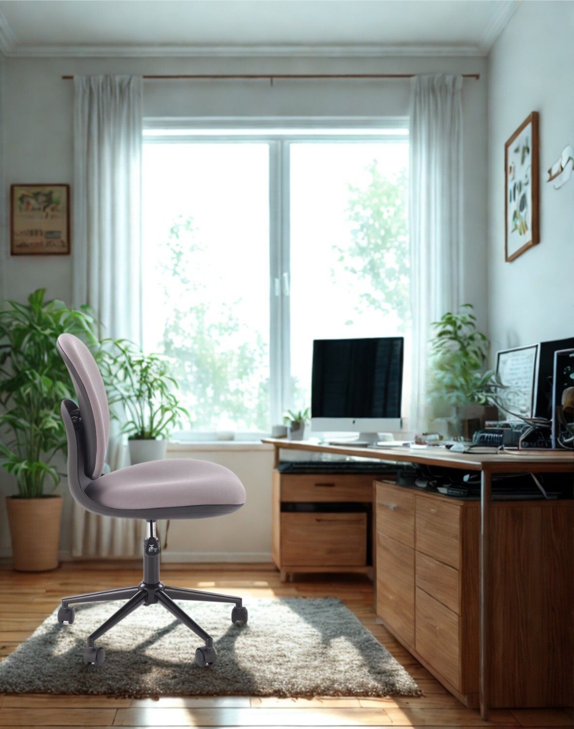 Projekt fotela akcentuje jego minimalistyczny charakter – brak podłokietników i zagłówka, co sprawia, że jest idealny do biurka.