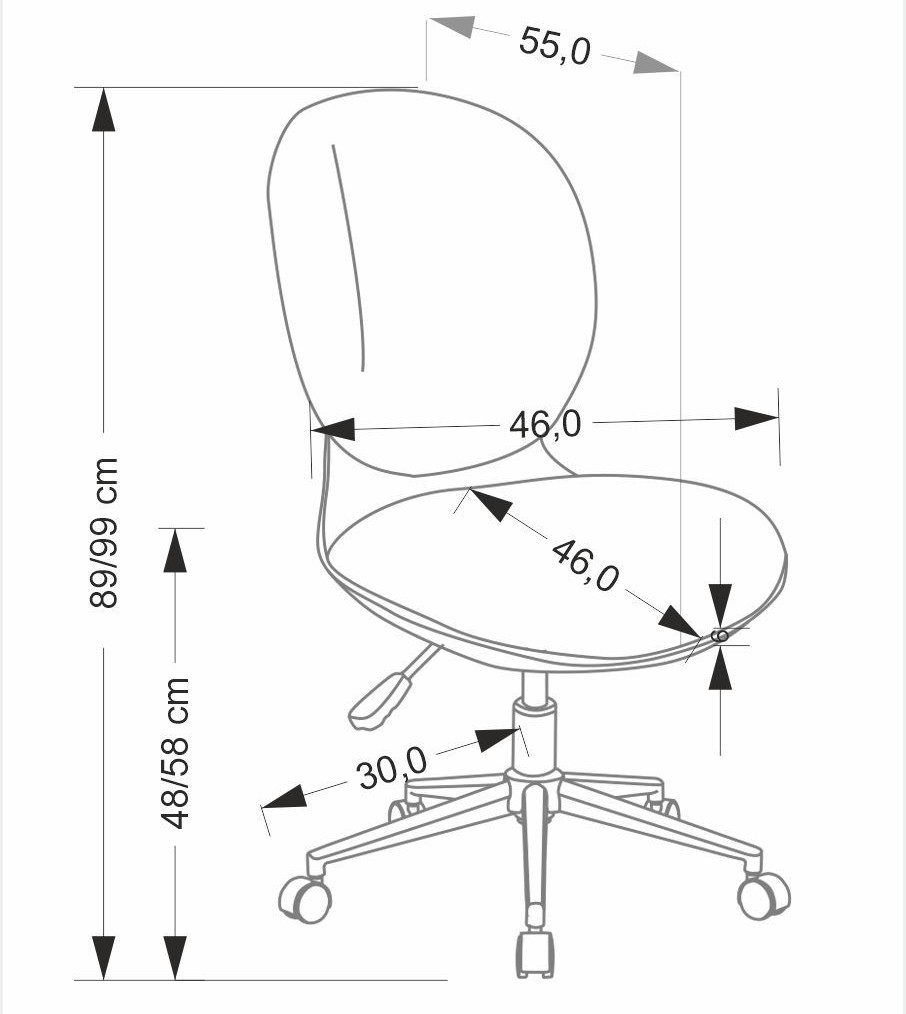 Model oferuje płynną regulację wysokości siedziska (48–58 cm) oraz obracanie, co zwiększa jego ergonomię i ułatwia adaptację do różnego wzrostu użytkownika.