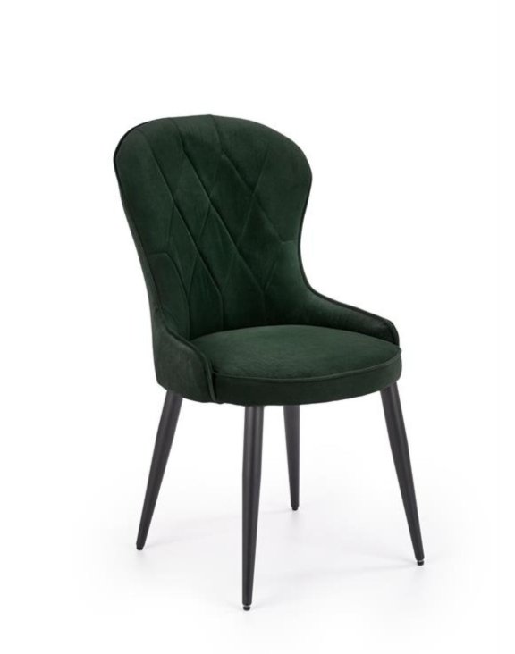 Krzesło jest tapicerowane lekko połyskującą welwetową tkaniną w kolorze ciemna zieleń.