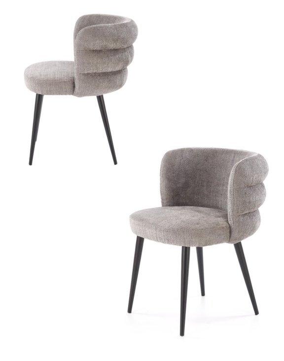 Model wyróżnia się miękkim, tapicerowanym siedziskiem oraz efektownym, zaokrąglonym oparciem o dekoracyjnym, falowanym profilu, które subtelnie otula plecy i zapewnia komfort podczas siedzenia.