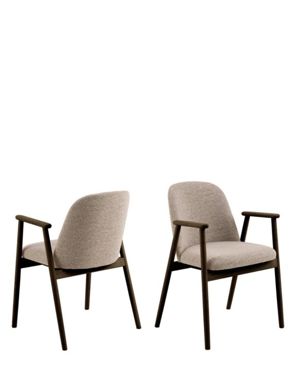Podłokietniki zapewniają dodatkową wygodę, a całość wspiera się na nogach z dymionego dębu, lakierowanego na matowo (NC lacquer). Ciemniejsze wybarwienie drewna dodaje wyrazistego charakteru i głębi, kontrastując subtelnie z jasną tapicerką.