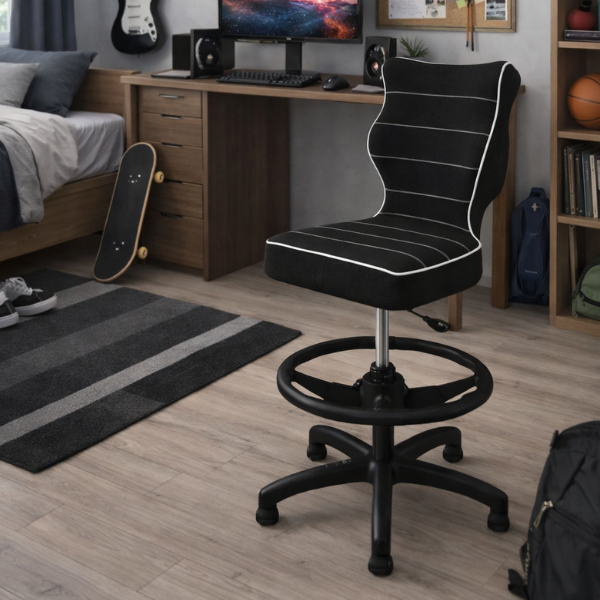 Krzesło Petit z podnóżkiem to ergonomiczne krzesło obrotowe zaprojektowane specjalnie z myślą o dzieciach w wieku szkolnym.