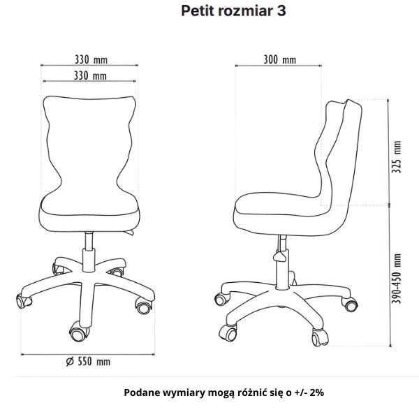 Wymiary: szerokość oparcia 330 mm, średnica postawy 550 mm, szerokość siedziska 300mm, wysokość oparcia 325 mm, wysokość siedziska 390 - 450 mm.