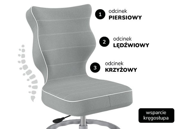 Jego konstrukcja wspiera prawidłową postawę ciała podczas nauki i codziennej pracy przy biurku, pomagając ograniczyć przeciążenia kręgosłupa już od najmłodszych lat.