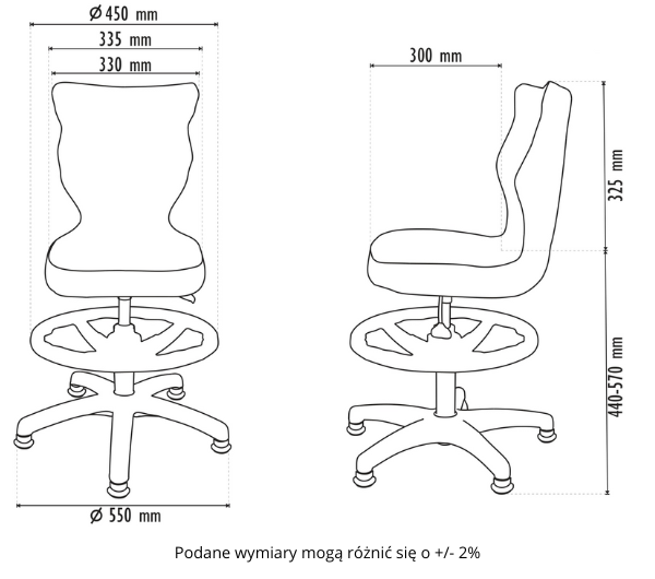 Wymiary: szerokość oparcia 330 mm, szerokość siedziska 335 mm, średnica podstawy 450 mm, głębokość siedziska 300 mm, wysokość oparcia 325 mm, regulacja wysokości krzesła w zakresie 440 - 570 mm.