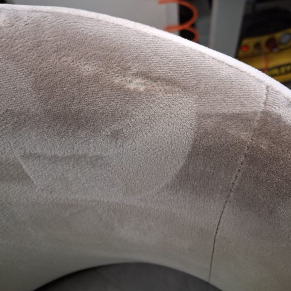 Krzesło tapicerowane jest tkaniną velvet w kolorze beżowym.