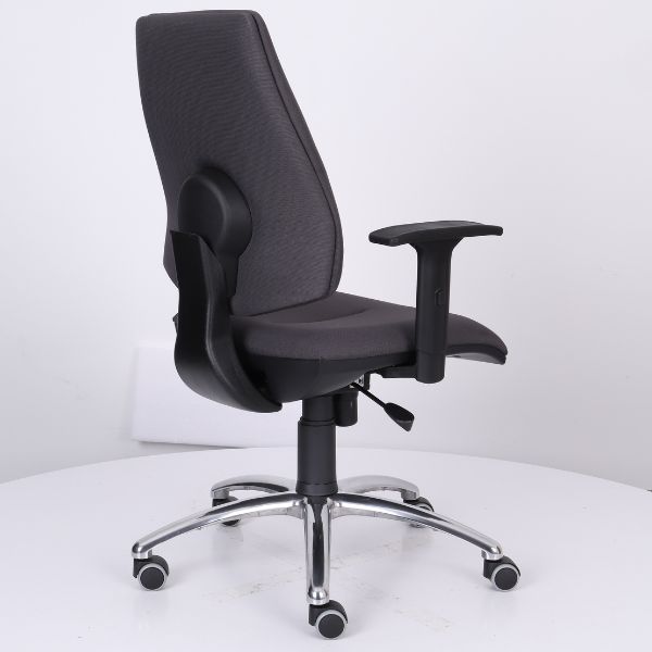 Wysokie jak na krzesło biurowe oparcie posiada ergonomiczny profil zapewniający odciążenie lędźwiowej części kręgosłupa,