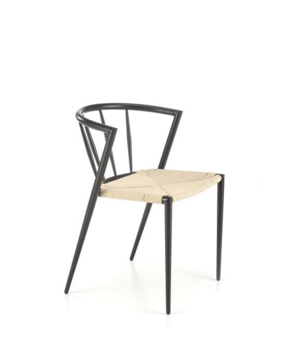 Oparcie i nóżki wykonane są z metalu malowane proszkowo w kolorze czarnym dzięki czemu są wytrzymałe, a siedzisko z naturalnego sznurka stanowi centralny element tego wyjątkowego krzesła.