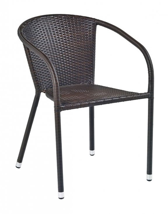Krzesło wykonano z rattanu syntetycznego (technorattan). Dostępny jest dla Państwa w kolorze ciemnobrązowym.
