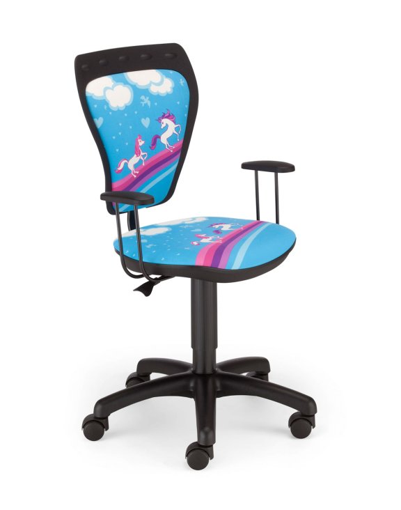 Krzesło obrotowe, dziecięce z tapicerowanym siedziskiem oraz profilowanym tapicerowanym oparciem, cieszące się dużym uznaniem naszych Klientów.