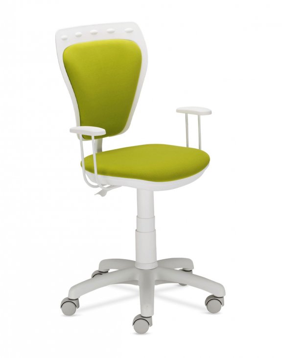Krzesło obrotowe dziecięce z tapicerowanym siedziskiem oraz profilowanym tapicerowanym oparciem.