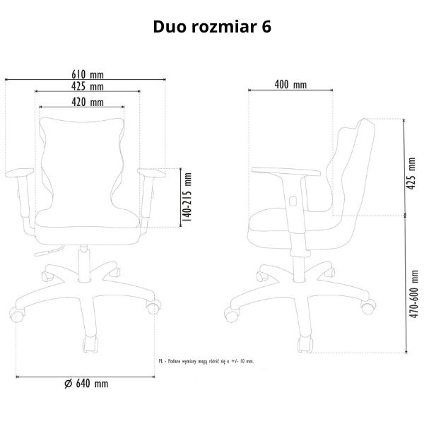 Wymiary: szerokość siedziska z podłokietnikami - 610 mm, szerokość siedziska - 425 mm, szerokość oparcia - 420 mm, regulacja podłokietników 140-215 mm, średnica podstawy - 640 mm, głębokość siedziska - 400 mm, wysokość oparcia 425 mm, regulacja 470 - 600 mm.
