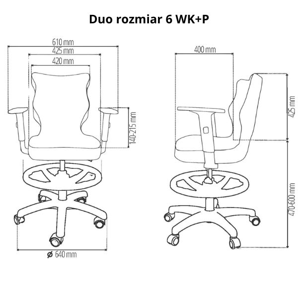 Wymiary: szerokość krzesła z podłokietnikami 610mm, szerokość siedziska 425 mm, szerokość oparcia 420 mm, regulacja podłokietników 140-215 mm, średnica podstawy 640 mm, głębokość siedziska 400 mm, wysokość oparcia 425 mm, regulacja wysokości 470 - 600 mm.