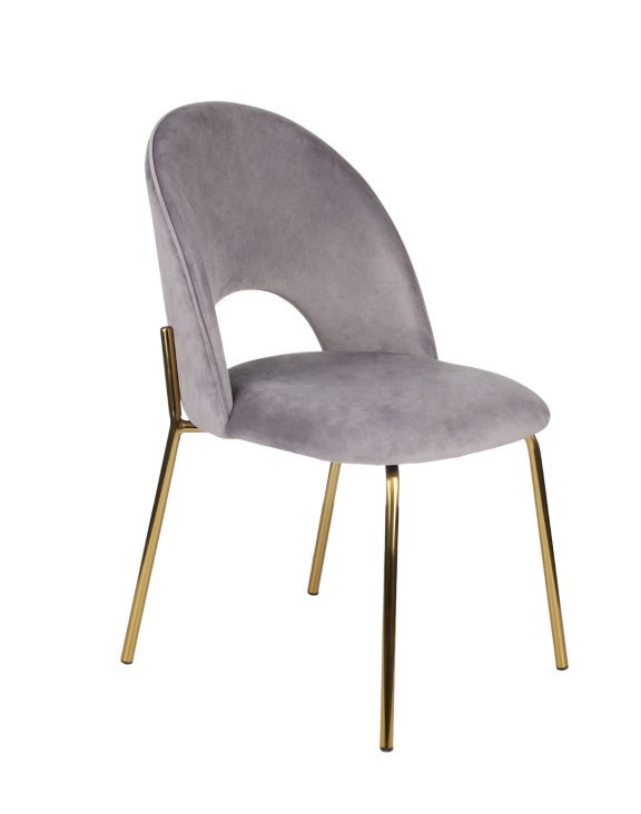 Krzesło do jadalni Molly Gold w kolorze szarym marki Avida Design ze złotymi nóżkami i miękką w dotyku tapicerką i designerska forma oparcia wpisuje się swą estetyką w najnowsze trendy wnętrzarskie.