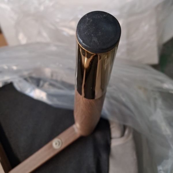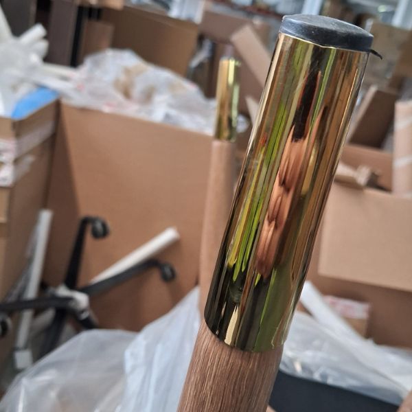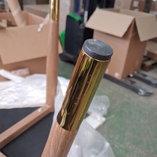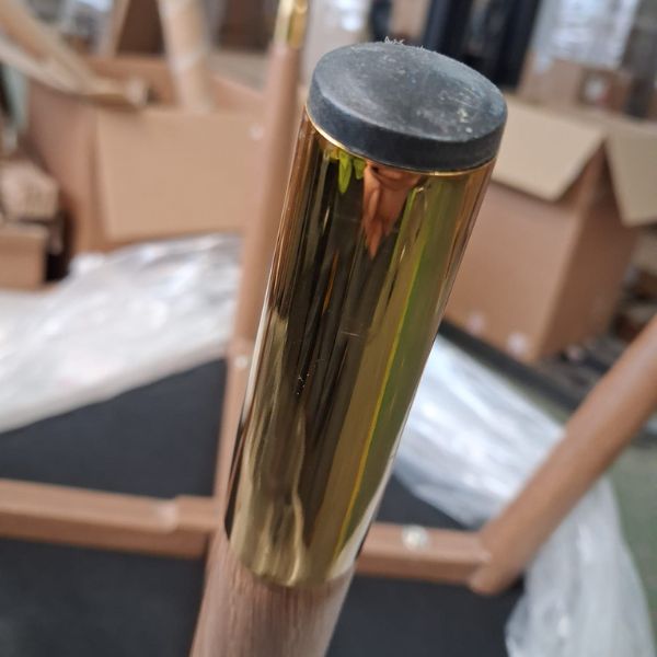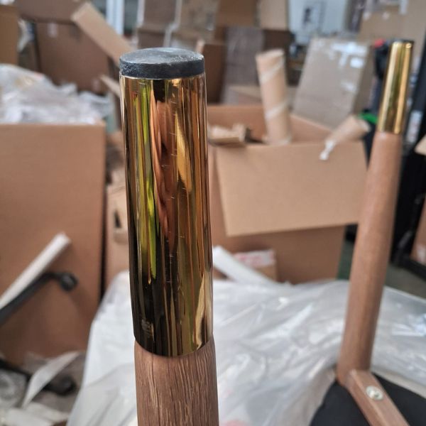 Oferowane przez nas krzesło ma metalowy stelaż w drewnopodobnej okleinie ze złotymi stopkami.
