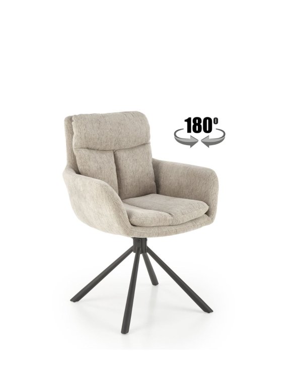 Krzesło jest tapicerowane tkaniną o ciekawej strukturze w kolorze beżowym.