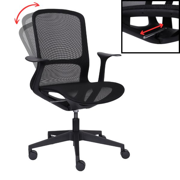 Siedzisko oraz wysokie oparcie wykonano z trwałej, elastycznej siatki w uniwersalnym czarnym kolorze.
