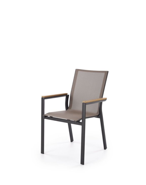 Siedzisko i oparcie wykonano z popielato-brązowej siatki, która jest przewiewna, odporna na warunki atmosferyczne i łatwa w utrzymaniu czystości.