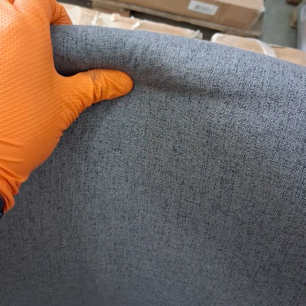 Krzesło jest dwustronnie pokryte miłą w dotyku tkaniną dostępną w odcieniu ciemnej i jasnej szarości.