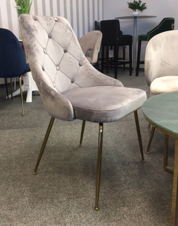 Krzesło jest tapicerowane miłą w dotyku tkaniną welwet w beżowym kolorze.