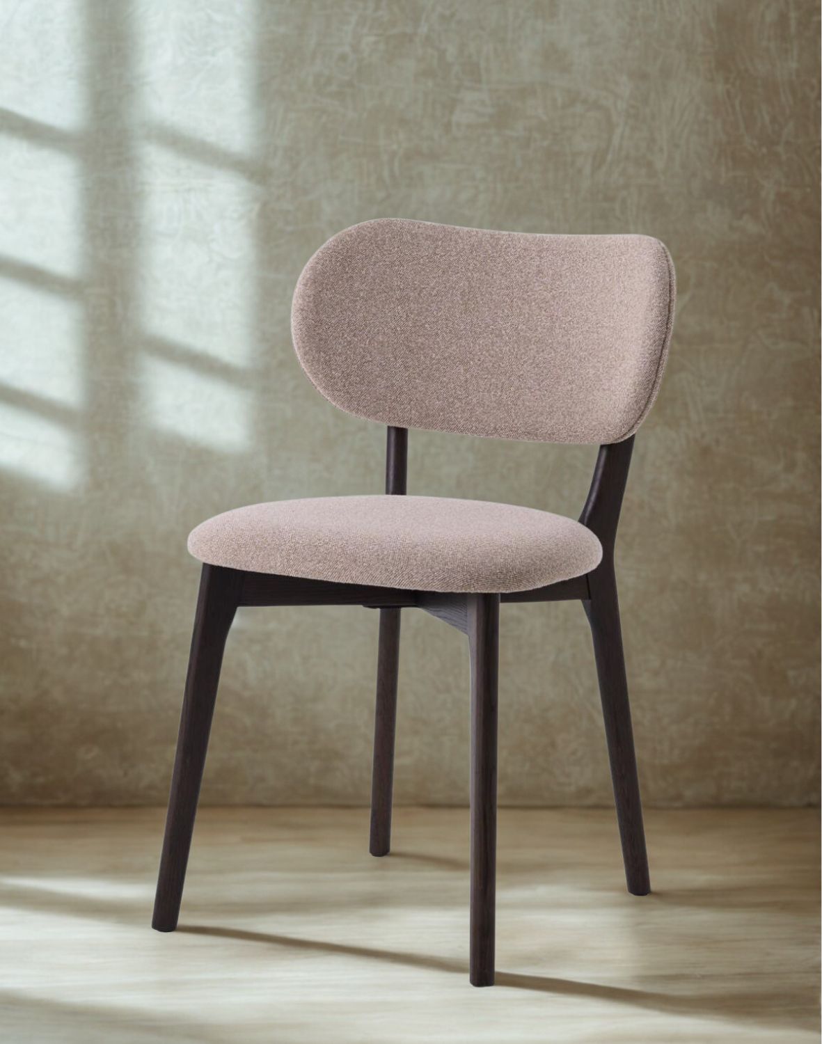 Krzesło tapicerowane jest tkaniną Lake 120 Sand, której wyjątkowa faktura została uzyskana dzięki zastosowaniu dekoracyjnej przędzy o pętelkowym splocie.