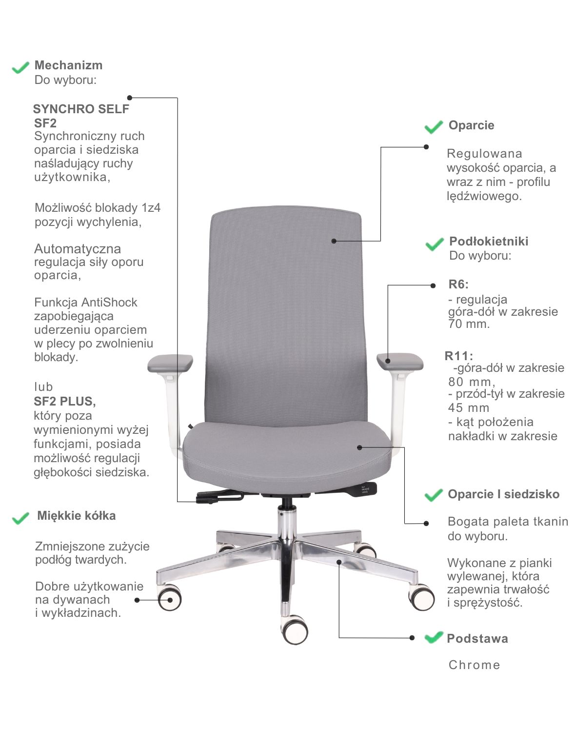Możliwość regulacji głębokości siedziska (mechanizm Synchro Self SF2 Plus) – pozwala dostosować odległość między oparciem a przednią krawędzią siedziska, co zapewnia lepsze podparcie ud i odciąża kolana.