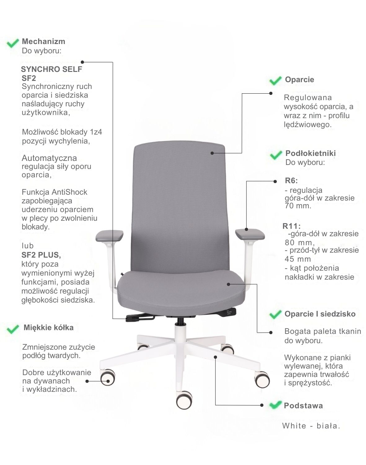 Możliwość regulacji głębokości siedziska (mechanizm Synchro Self SF2 Plus) – pozwala dostosować odległość między oparciem a przednią krawędzią siedziska, co zapewnia lepsze podparcie ud i odciąża kolana.
