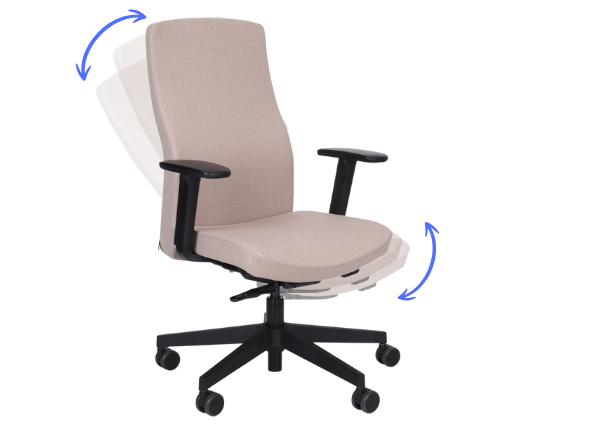Oparcie odchylające się z siedziskiem synchronicznie (ruch oparcia jest szybszy i dalszy), dając jednocześnie możliwość blokady w 4 płaszczyznach, w tym w klasycznej pozycji do pracy,