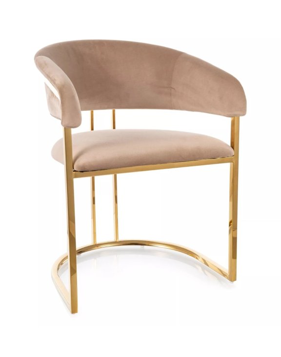 Beżowy kolor tapicerki w połączeniu ze złotym stelażem tworzy uniwersalną estetykę – pasuje zarówno do jadalni jak i salonu.