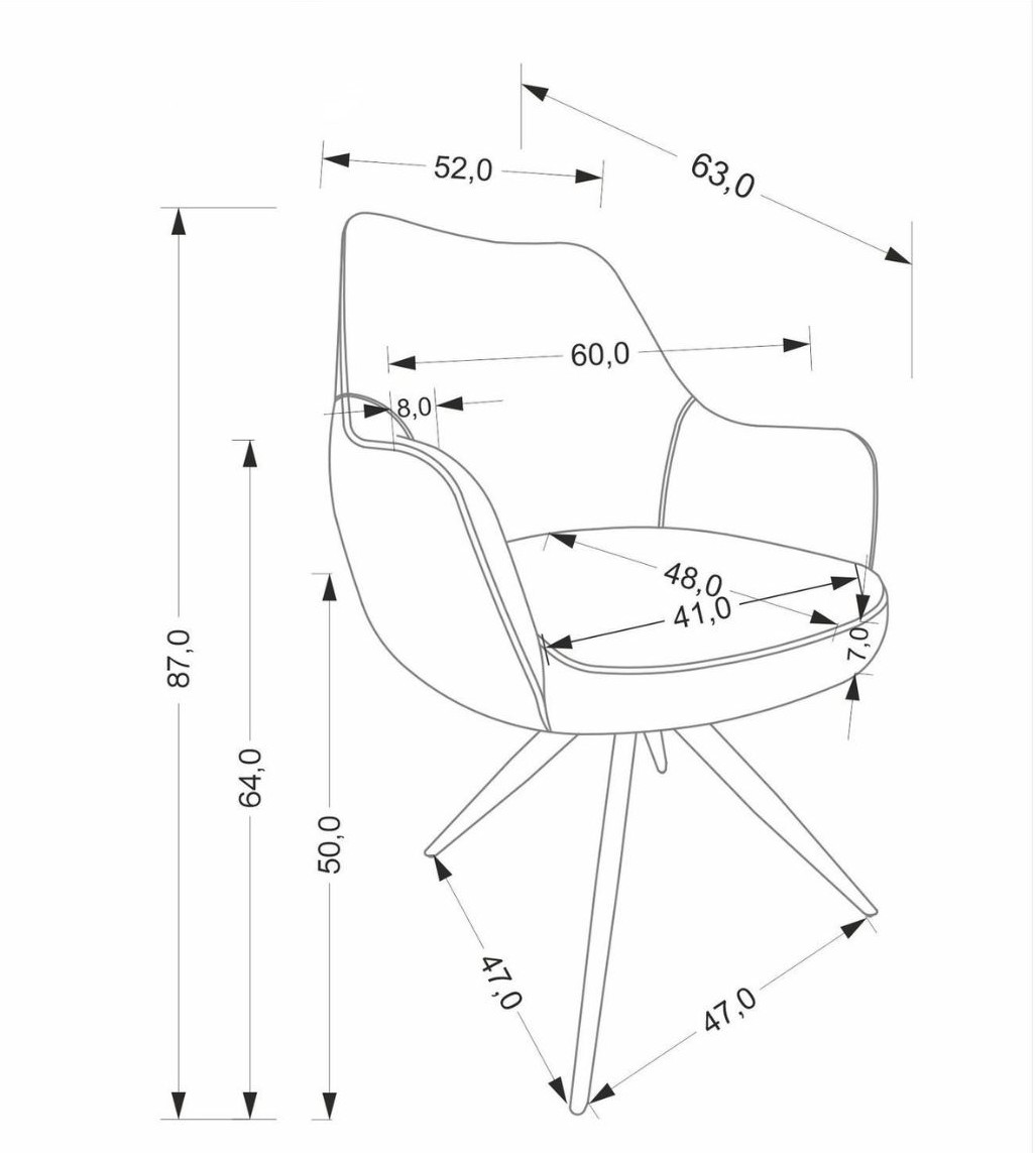 Dzięki proporcjom 60 cm szerokości × 63 cm głębokości × 87 cm wysokości, krzesło zapewnia wygodne miejsce do siedzenia, nie dominując jednocześnie przestrzeni.