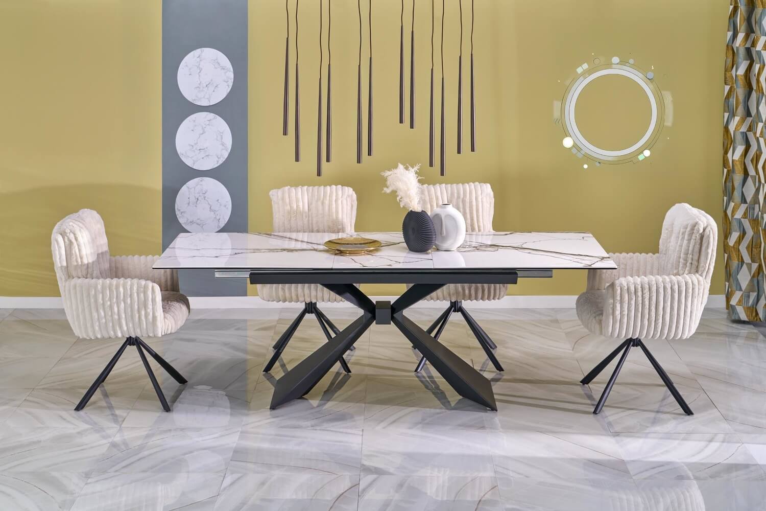 Krzesło K572 marki Halmar w delikatnym, kremowym kolorze to eleganckie krzesło tapicerowane, które łączy komfort siedzenia z uniwersalnym designem, idealnym do jadalni, kuchni, salonu czy przestrzeni wielofunkcyjnej.