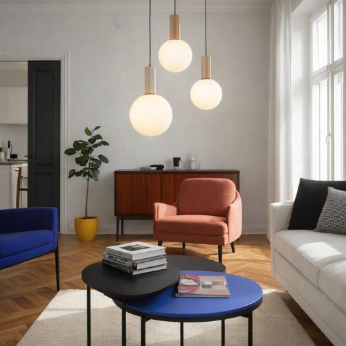 Układ trzech zwisów nadaje wnętrzu nowoczesnej lekkości i wprowadza efektowną kompozycję świetlną.