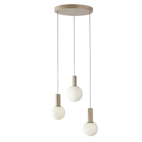 Potrójna lampa wisząca w odcieniach beżu z białymi kulami, to idealne rozwiązanie nad stół, wyspę kuchenną czy do salonu.