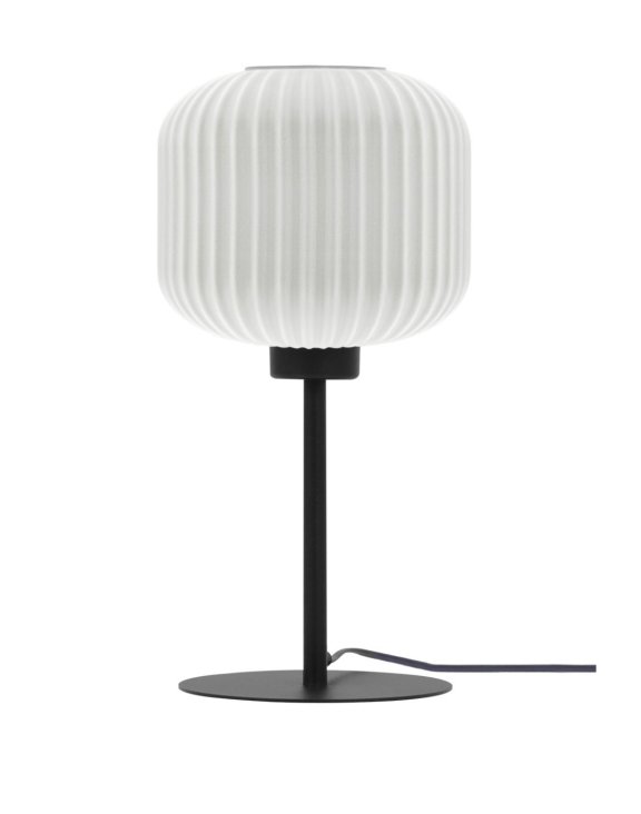 Jej biały ryflowany klosz delikatnie rozprasza światło, tworząc przytulną atmosferę.