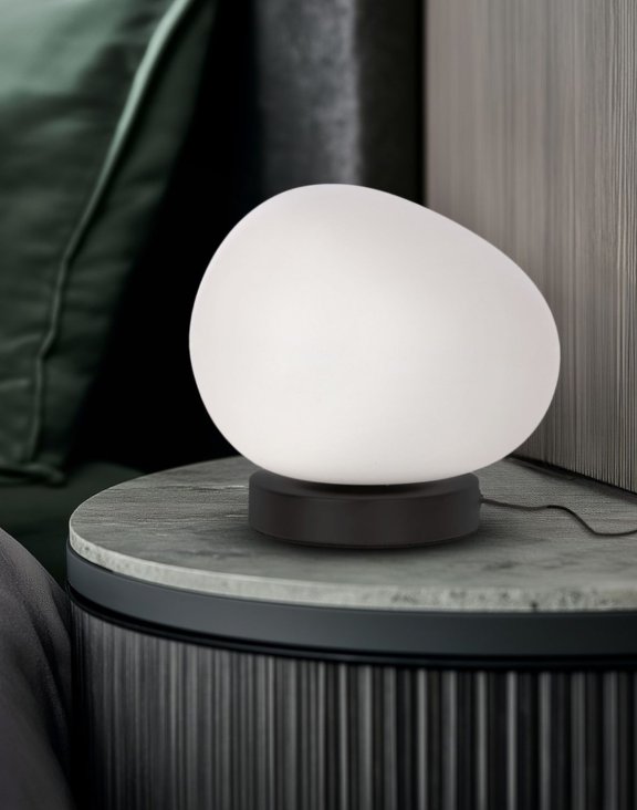 Lampa stołowa Stones wyróżnia się wyjątkowym, nieregularnym kształtem białego klosza, który przypomina wygładzony przez wodę kamień. Dzięki temu każda przestrzeń zyskuje subtelny, organiczny akcent. Umieszczona na stoliku nocnym, komodzie lub biurku stanie się nie tylko źródłem światła, ale również stylową ozdobą wnętrza.