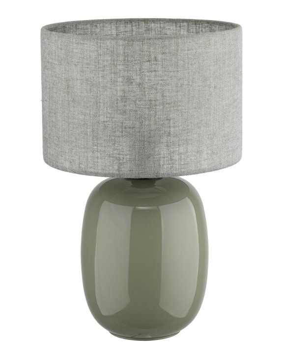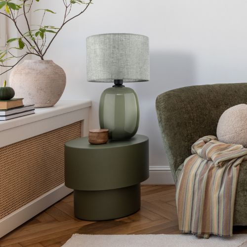 Podstawą lampy jest zaokrąglona, ceramiczna bryła w stonowanym, oliwkowym odcieniu. Gładka, lekko połyskująca powierzchnia nadaje jej szlachetnego wyglądu i sprawia, że lampka prezentuje się jak designerski element wystroju, nawet gdy jest wyłączona.