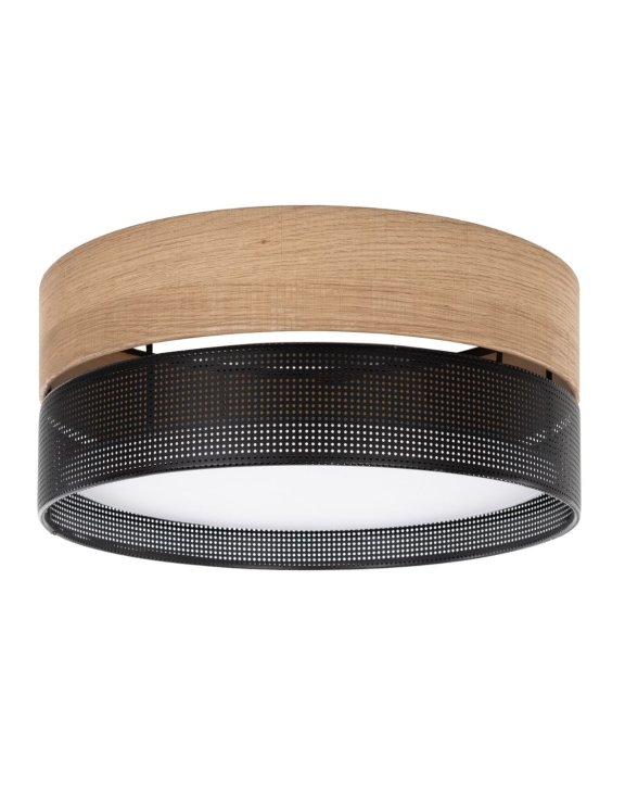 Abażur wykonany z forniru modyfikowanego i czarnej folii PCV z perforacjami tworzy interesujący wzór, który z pewnością wzbogaca estetykę lampy i nadaje jej niepowtarzalnego wyglądu.